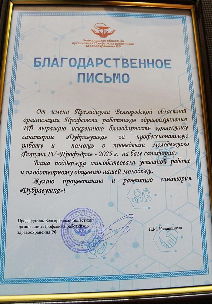 На подведении итогов мероприятия Николай Михайлович вручил директору санатория Захарову Д.И. Благодарственное письмо за профессиональную работу и помощь в проведении молодежного Форума IV «ПрофЗдрав - 2025 на базе санатория».