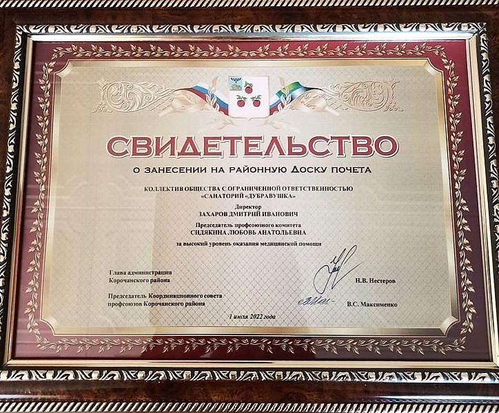 И санаторий «Дубравушка» так же был удостоен такой награды за высокий уровень оказания медицинской помощи.