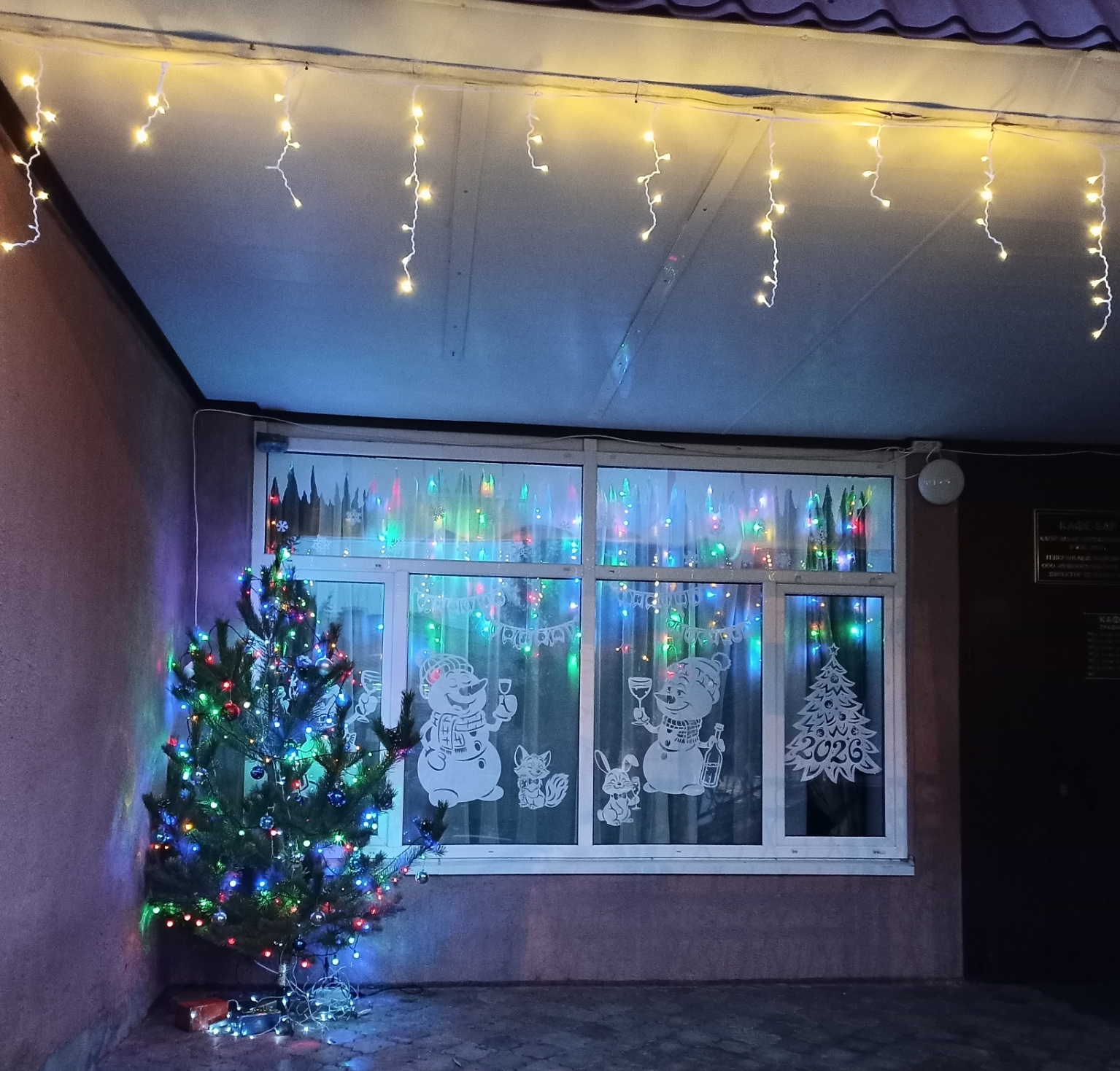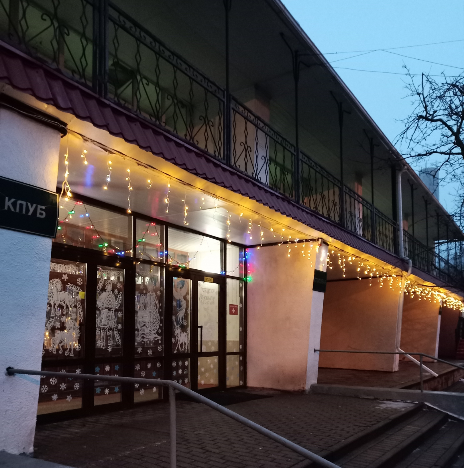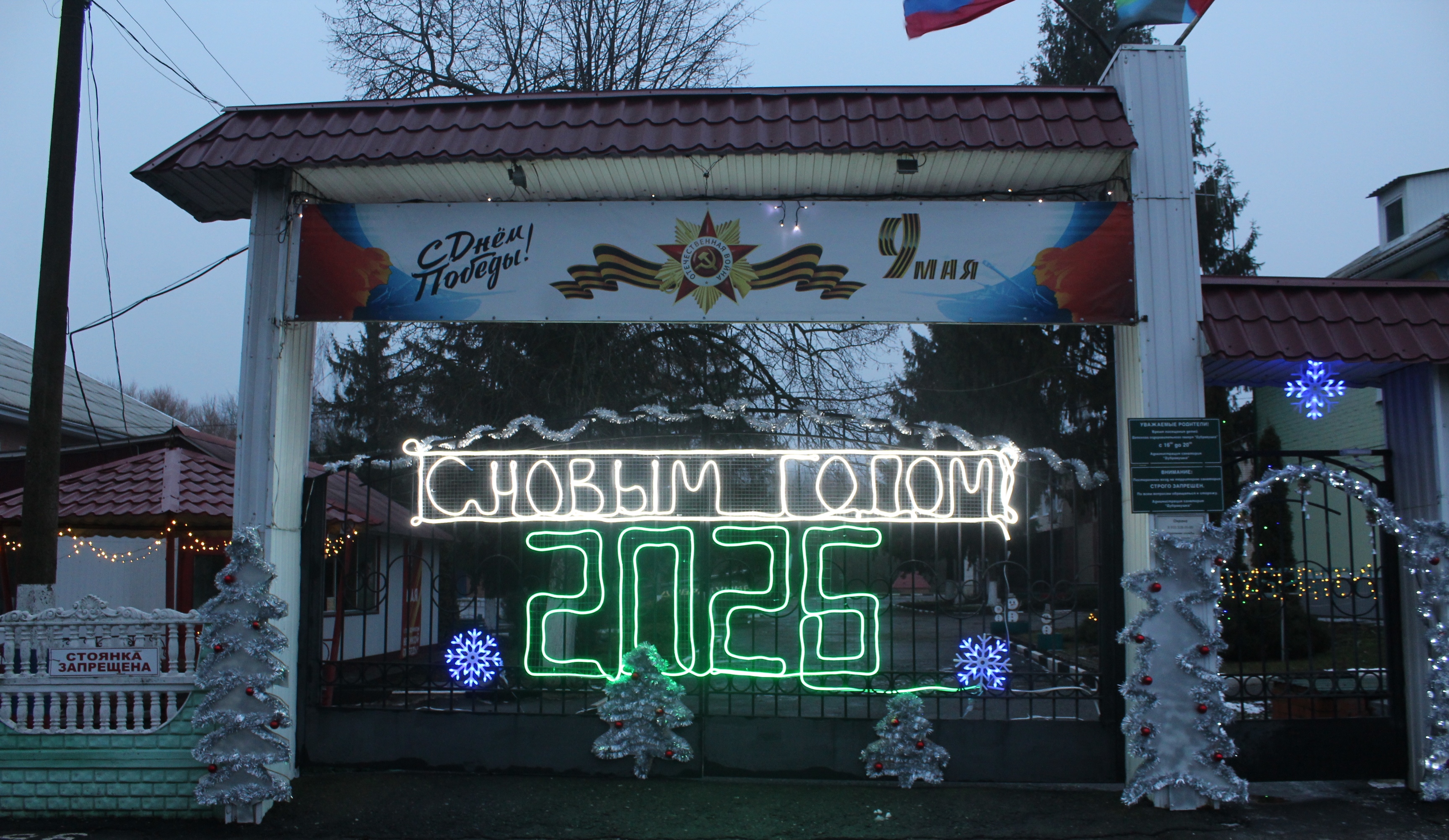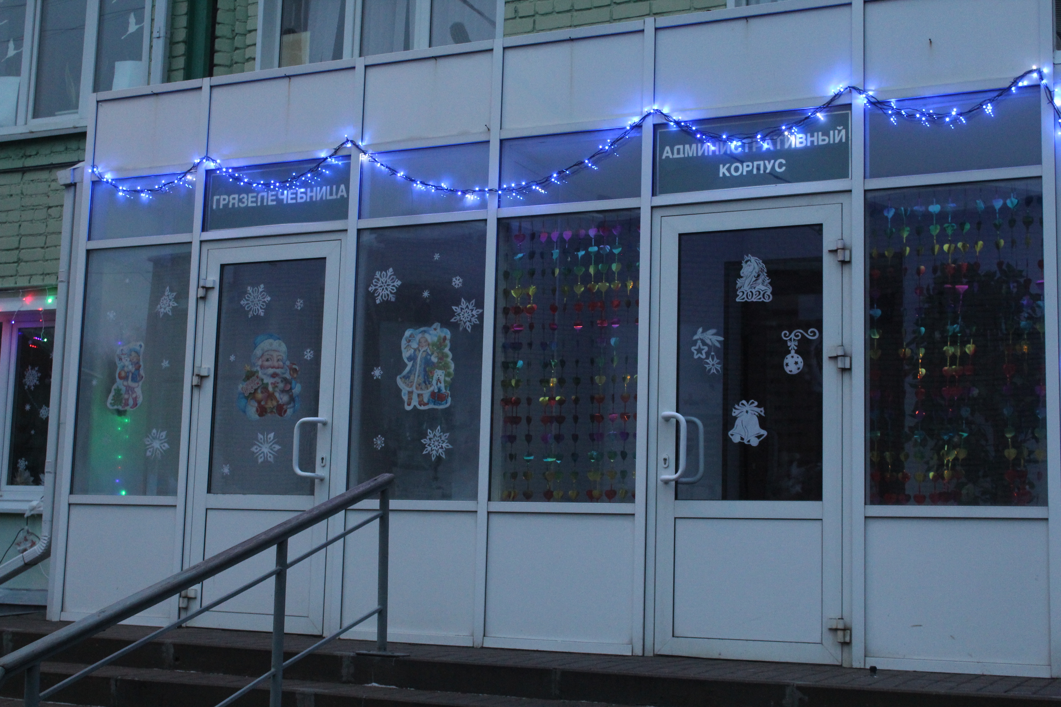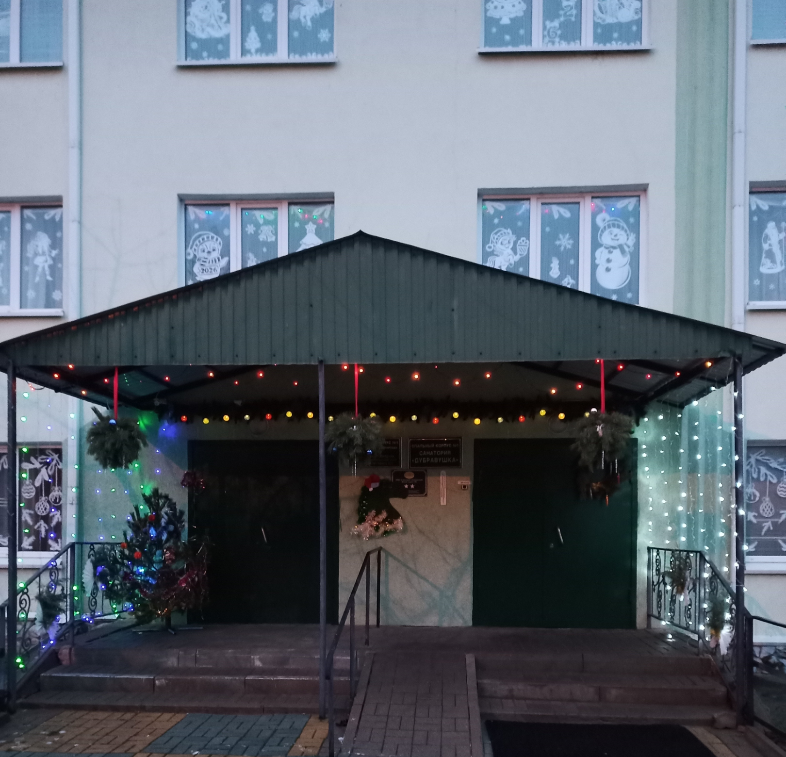 У входа вдоль дороги санаторий освещается фотозоной в виде шаров и воротами с цифрами наступающего 2026 года. В ночное время особенно эффектно смотрятся гирлянды на деревьях и зданиях.