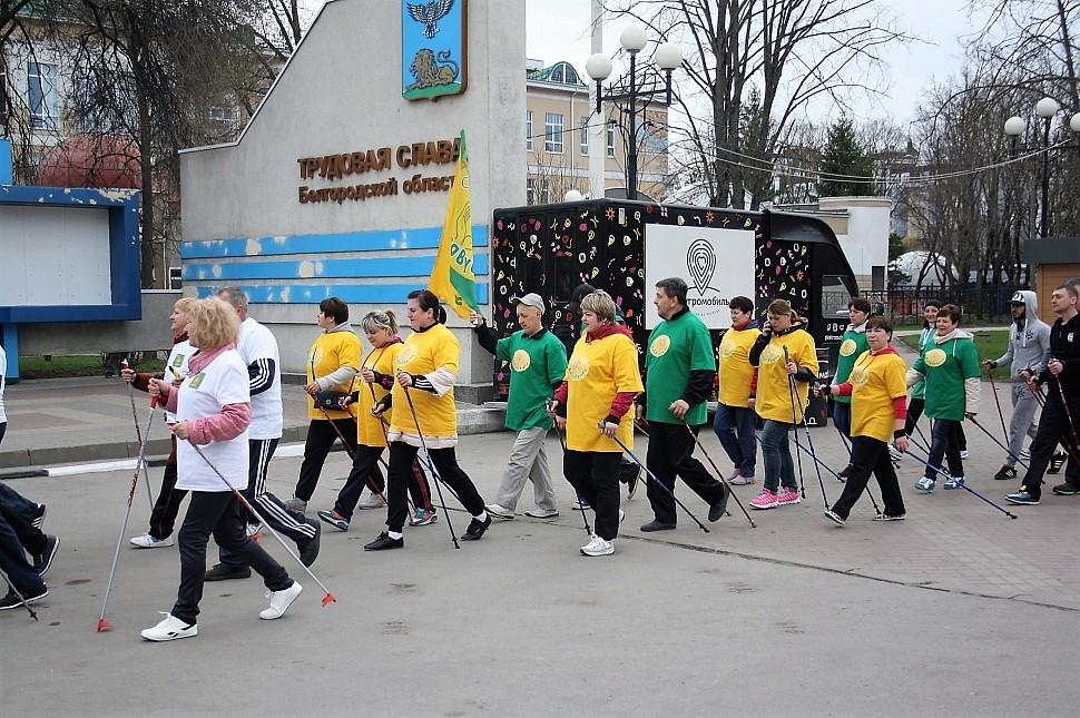 После 10-ти минутной разминки участники выстроились в колону по 4 человека и по сигналу руководителя Первой Белгородской школы финской ходьбы В.Б. Жучковой отправились по тропе здоровья.