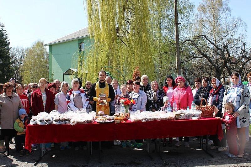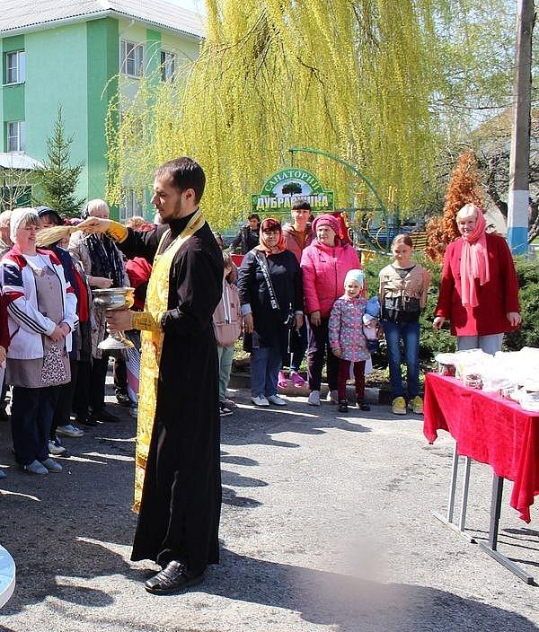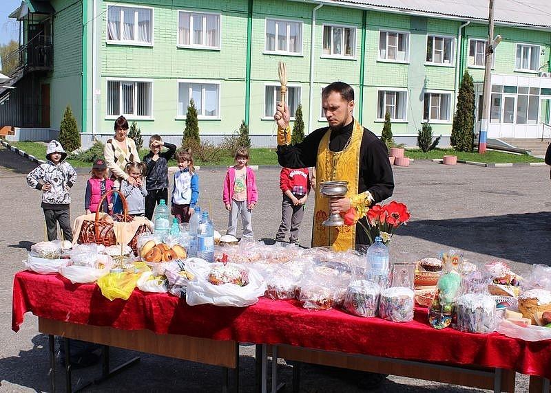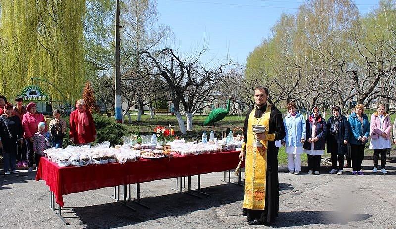 Сотрудники, отдыхающие и эвакуированные жители ДНР, собрались у здания клуба, чтобы освятить куличи, которые позже займут свое место на праздничном столе.