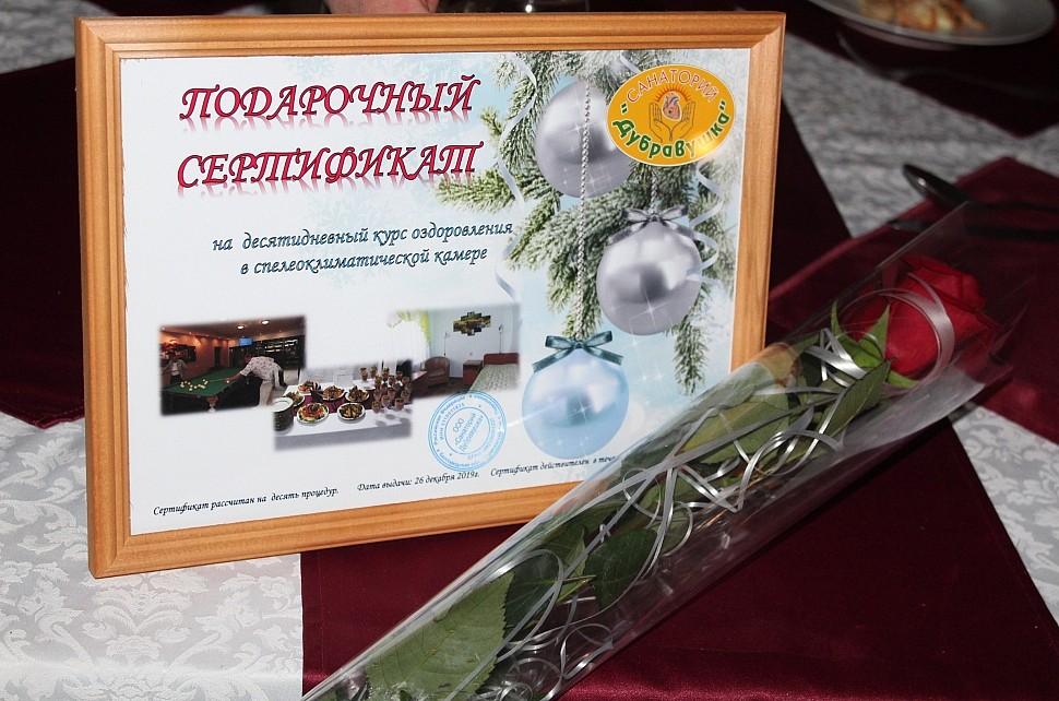 Санаторий «Дубравушка» провел новый десятый розыгрыш десятидневного курса оздоровления в спелеоклиматической камере санатория «Дубравушка». Этот конкурс мы решили приурочить к празднику Рождества Христова, сертификат действует в течение двух месяцев с правом дарения. Наличие санаторно-курортной карты данная процедура не требует. Старт был дан 10 декабря, а завершился 24 декабря 2019 года. Для участия в розыгрыше необходимо было стать участником группы в соцсетях, «Одноклассники» и в «В Контакте». В розыгрыше приняло участие более трёхсот человек.