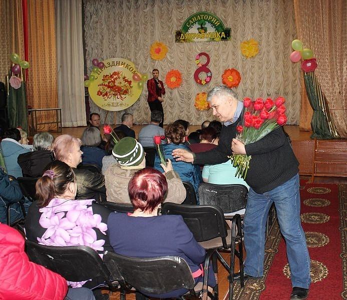 В завершении мероприятия мужчины санатория вручили цветы артистам и всем дамам, находящимся в зале.