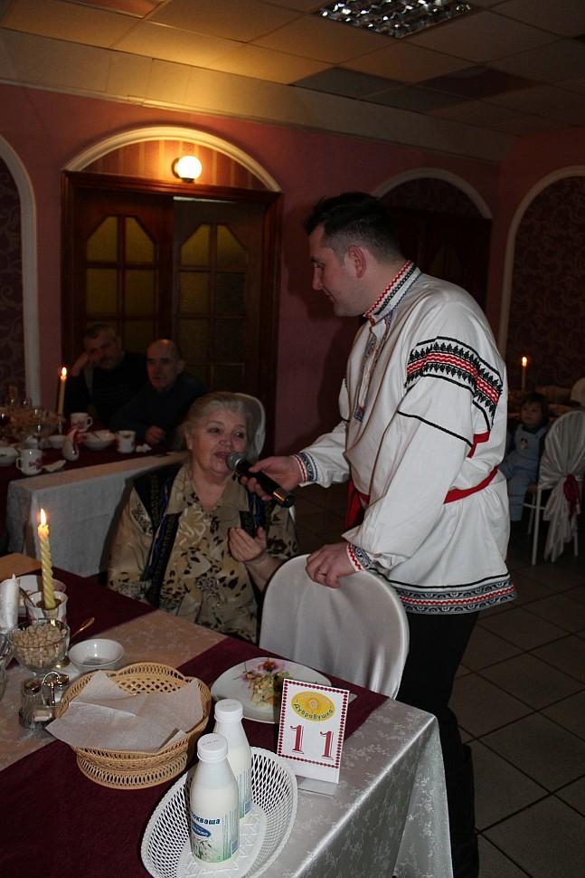 Ведущий праздника познакомил всех присутствующихс традициями, связаннымис обрядом обсевания, «хождения по домам» и обязательным угощением гостей, провёл конкурс Новогодних песен.