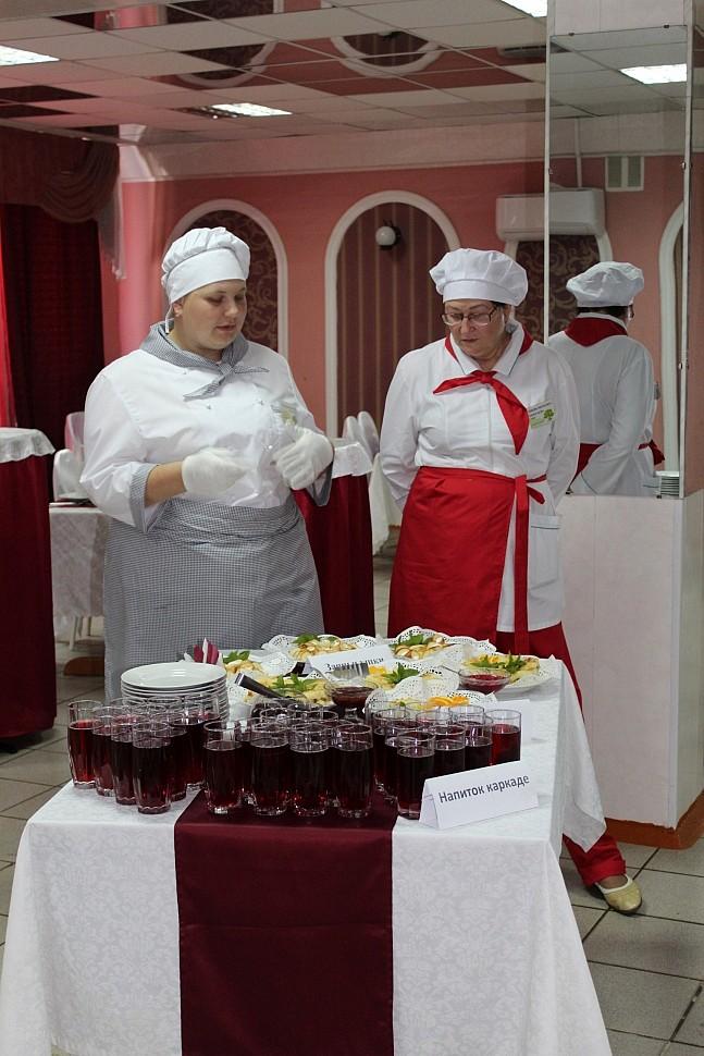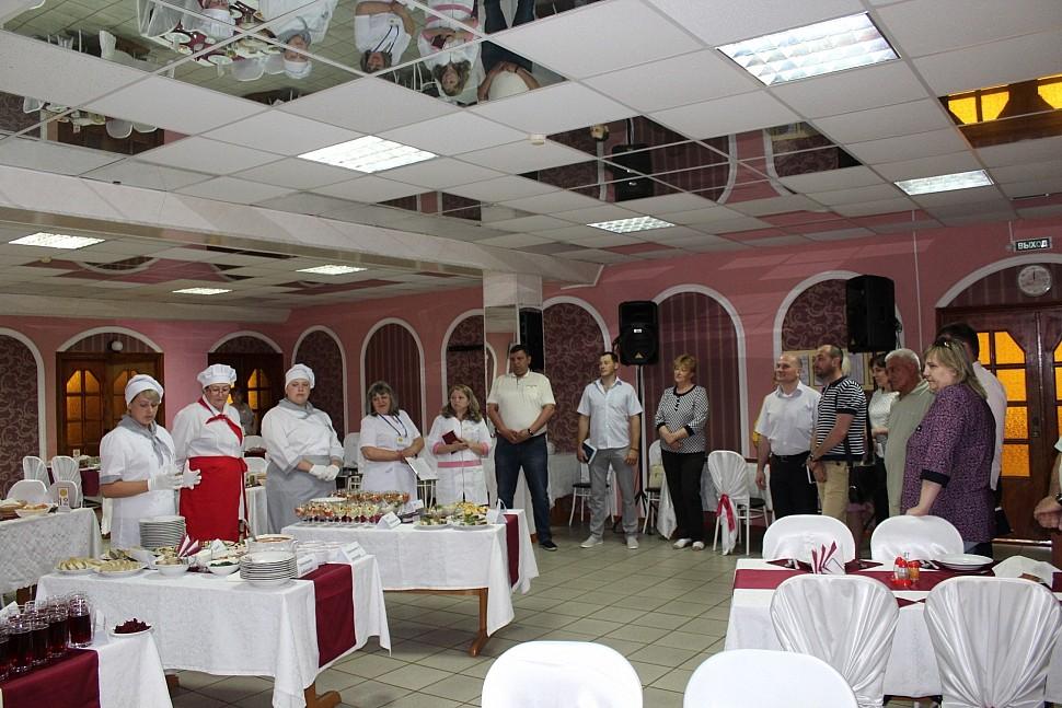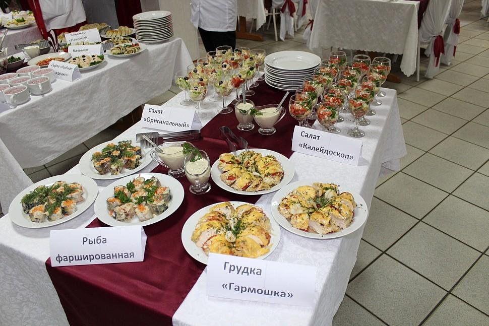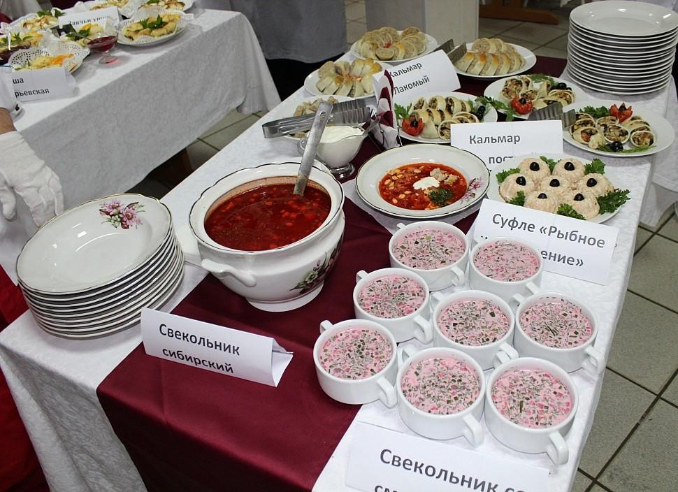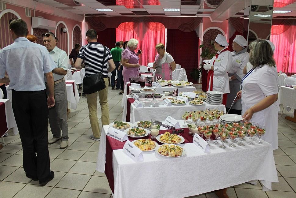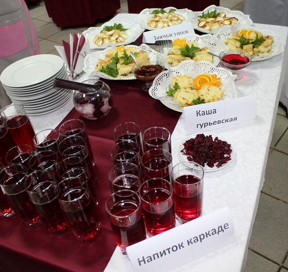 Представителям предложили продегустировать блюда, приготовленные поварами столовой из сырья, поставленного поставщиками. Были предложены салаты «Оригинальный» и «Калейдоскоп», рыбные блюда – это рыба фаршированная, рыбное суфле, из мяса курицы грудка «Гармошка», разнообразие блюд из кальмаров и свёклы - свекольник «Сибирский» и со сметаной. На десерт было предложено - каша «Гурьевская», «Заячьи ушки» и напиток, охлаждающий в летний период «Каркаде».