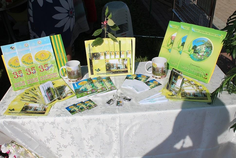 Сотрудники санатория во главе с директором Дмитрием Ивановичем Захаровым представили свою рекламную продукцию: буклеты, визитные карточки, календари, проспекты, брелоки, кружки и стенд «Спелеоклиматическая